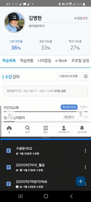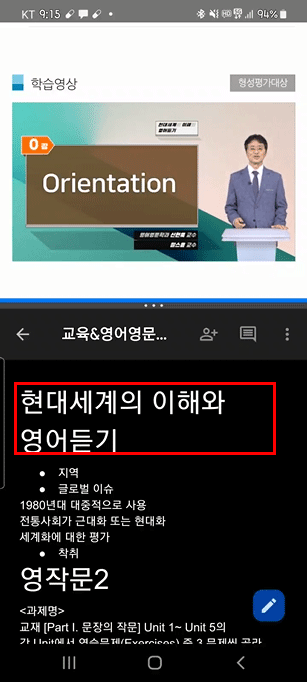마지막으로 방송통신대학교 영어영문학과 '현대세계의 이해와 영어듣기' 과목을 공부하는 스마트폰 화면을 사례로 보여 드리겠습니다.