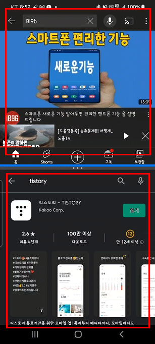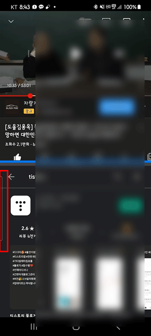 다중화면을 활용한다함은 위 아이콘을 선택하여 두개의 화면에서 각각 작업을 할 수 있다는 의미입니다. 여기서는 위에는 유튜브동영상을 아래에는 구글 플레이스토어를 띄어서 유튜브를 보면서 새로운 앱을 까는 것을 예로 들어 볼께요.