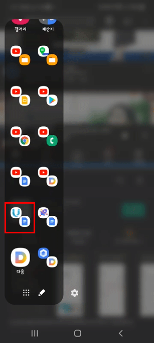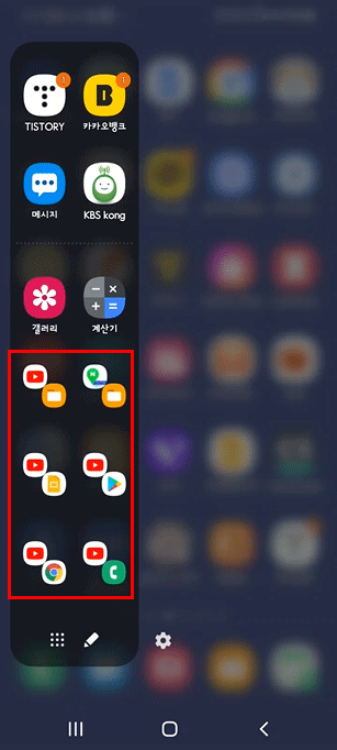 오른쪽의 버튼이 다중화면을 생성해서 엣지화면에 등록하는 버튼입니다. 그 버튼을 선택하면 다중화면아이콘이 생성되는데, 잠깐 후에는 저 아이콘이 사라지기 때문에 없어지기 전에 선택하면 됩니다.