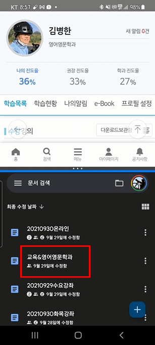 이 아이콘을 선택하면 화면을 둘로 나누어서 학습하면서 구글문서에 필기를 할 수 있습니다. 저는 [교육&영어영문학과]라는 문서를 만들어 계속 업데이트하면서 학습노트를 구성하고 있습니다. 물론 이 방법은 수면을 취하기 전에도 가능한 방법입니다. 제가 일찍이 가장 게으른 학습법으로 포스팅한 것이 있습니다.