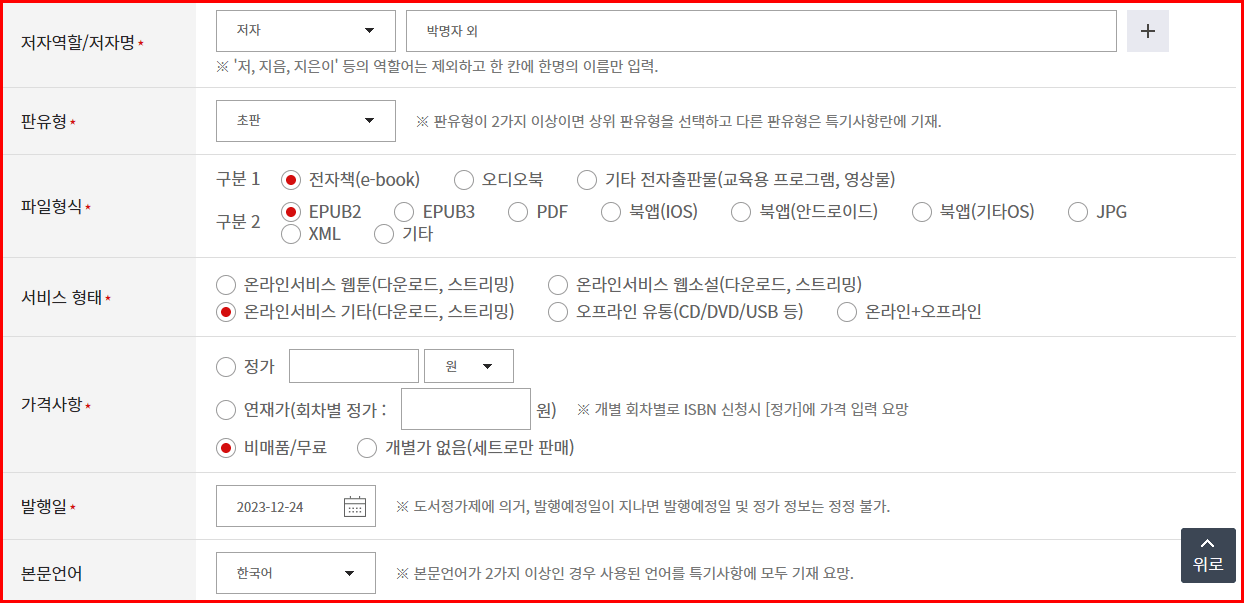 출판 서적과 관련된 정보 입력이 이어집니다. 유료, 무료도 이곳에서 정합니다.