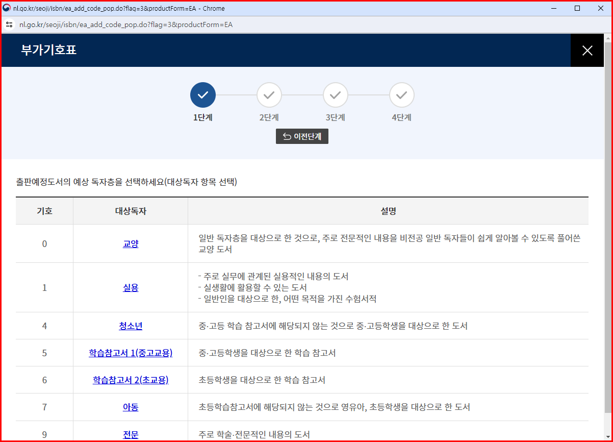 이어지는 '부가 번호'도 주어진 번호를 선택합니다. 종이책과 전자책의 구별부터 시작해서 도서십진분류에 입각한 번호가 부여되어 ISBN을 보충하는 의의가 있습니다.