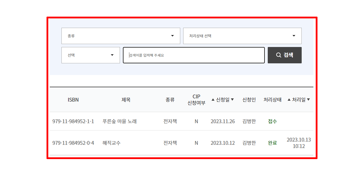 ISBN 발급을 신청한 도서를 조회하면 해당 도서가 리스트로 출력됩니다.