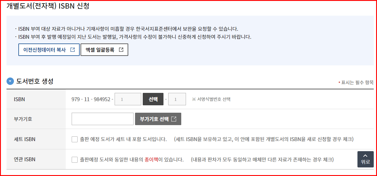 국립중앙도서관의 서지관리시스템에 ISBN을 신청합니다. 국가 번호 및 발행자 번호는 이미 정해진 상태에서 마지막 두 자리 숫자를 지정합니다. '선택'을 누르면 골라 입력할 수 있습니다.