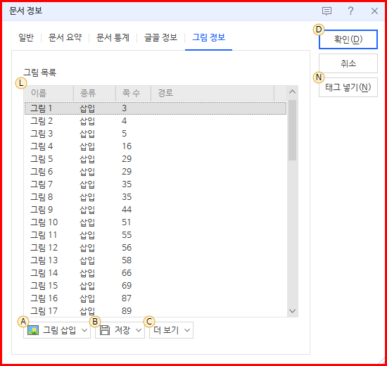 아래한글 최신 버전에서는 문서에 포함된 그림(이미지) 파일을 한꺼번에 저장하는 방법이 있습니다. 방법은 '문서 정보'를 이용하는 것입니다. '문서 정보' 마지막 탭은 '그림 정보'입니다. 이곳을 선택하면 아래에 '저장' 아이콘이 있습니다. 이것을 이용하여 전체 그림을 쉽게 저장할 수 있습니다.