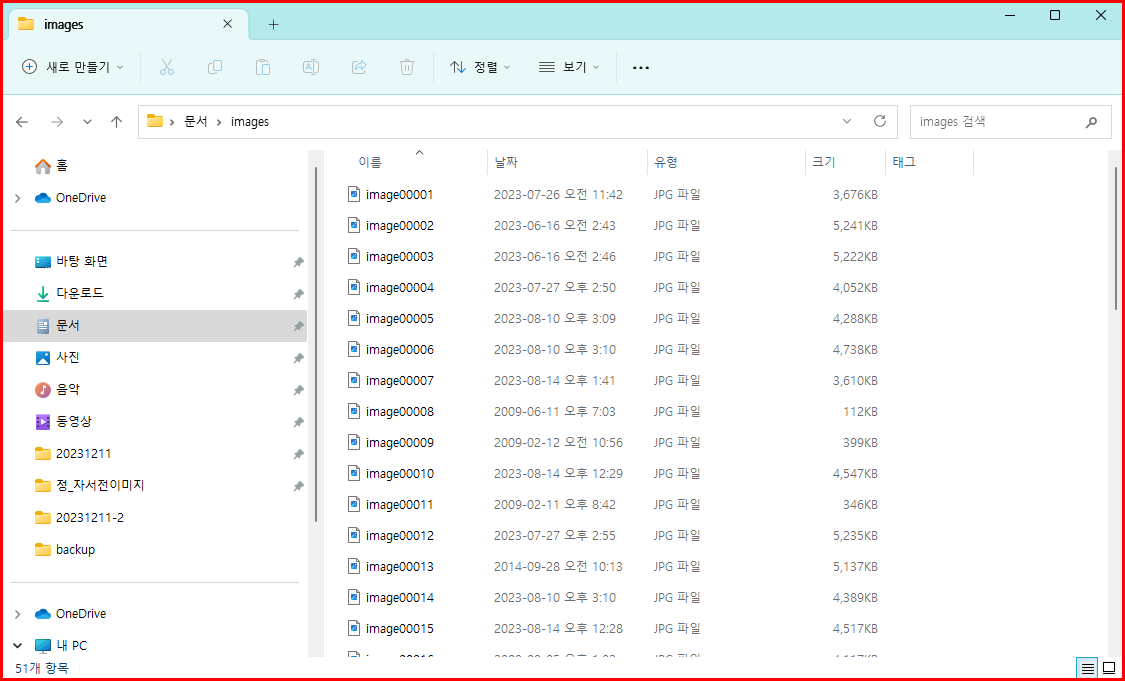 제 경우는 문서 파일이 있는 폴더 아래 'images' 폴더를 만들고 그곳에 저장하도록 했습니다. 결과를 확인하기 위해 탐색기를 열어 확인합니다. 물론 해당 폴더를 엽니다. '문서 > images' 폴더를 열었더니 순서대로 저장됐음을 확인할 수 있습니다.