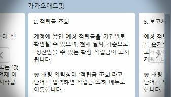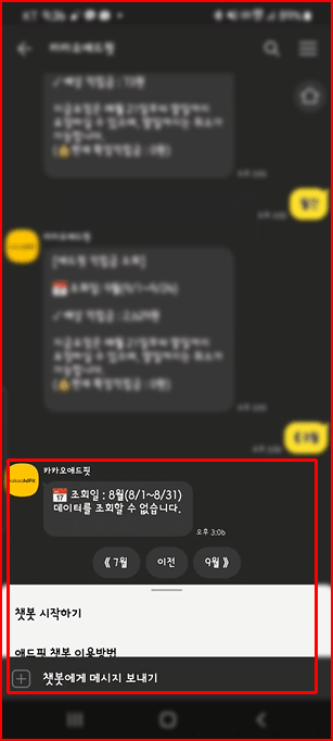 카카오애드핏 채널 선택 후에 챗봇 채팅을 선택하고 [애드핏 적립금 조회]를 보내면 챗봇이 그간의 적립금 현황을 알려줍니다.