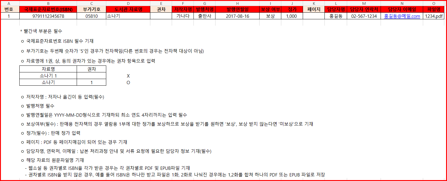 서식을 다운로드합니다. 아래와 같은 안내를 따라 양식을 내려받아 주어진 서식대로 작성하여 제출합니다. 다음은 국립중앙도서관 납본 시스템에서 제공한 안내 자료입니다.