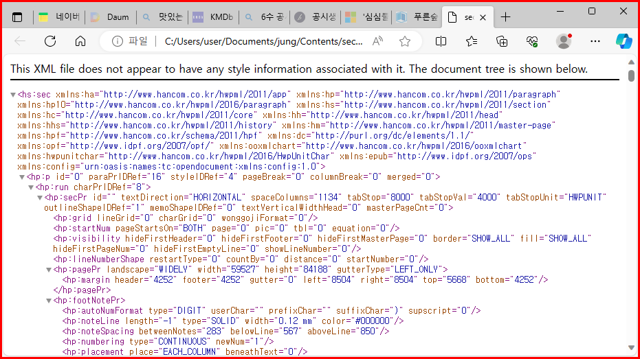contents 폴더의 'section0.xml' 내용은 아래와 같은 구조화된 XML 파일 형식으로 구성됐음을 알 수 있습니다.