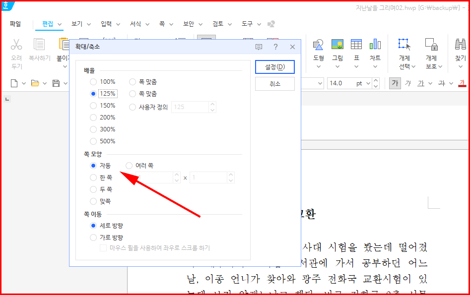 사용하다 보면 쪽이 2개, 4개로 나뉘어 보여 불편할 때가 있습니다. 그 이유는 '보기' 옵션의 '쪽 모양'을 '자동'으로 했기 때문입니다. '한쪽'이 사용하기에 편합니다. 사용자의 취향에 따라 다르지만 일반적으로 노년에게는 한쪽으로 편집을 하는 것이 좋지 싶습니다.