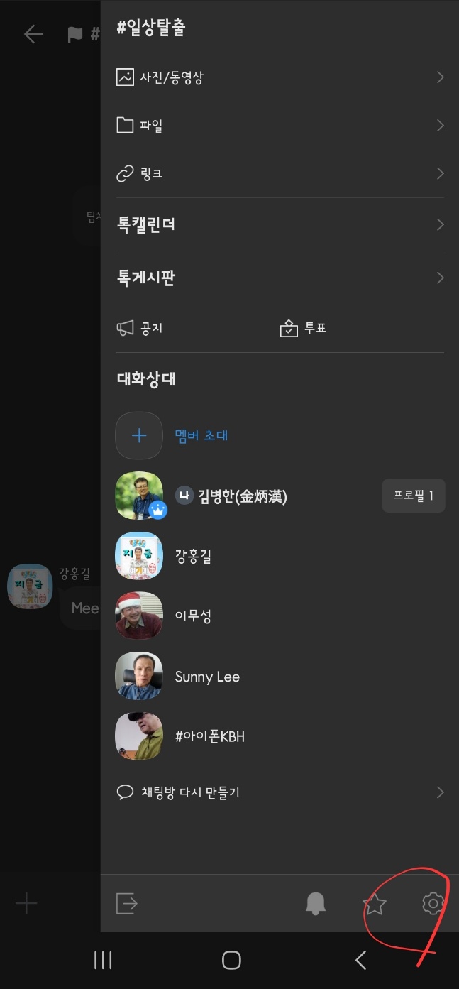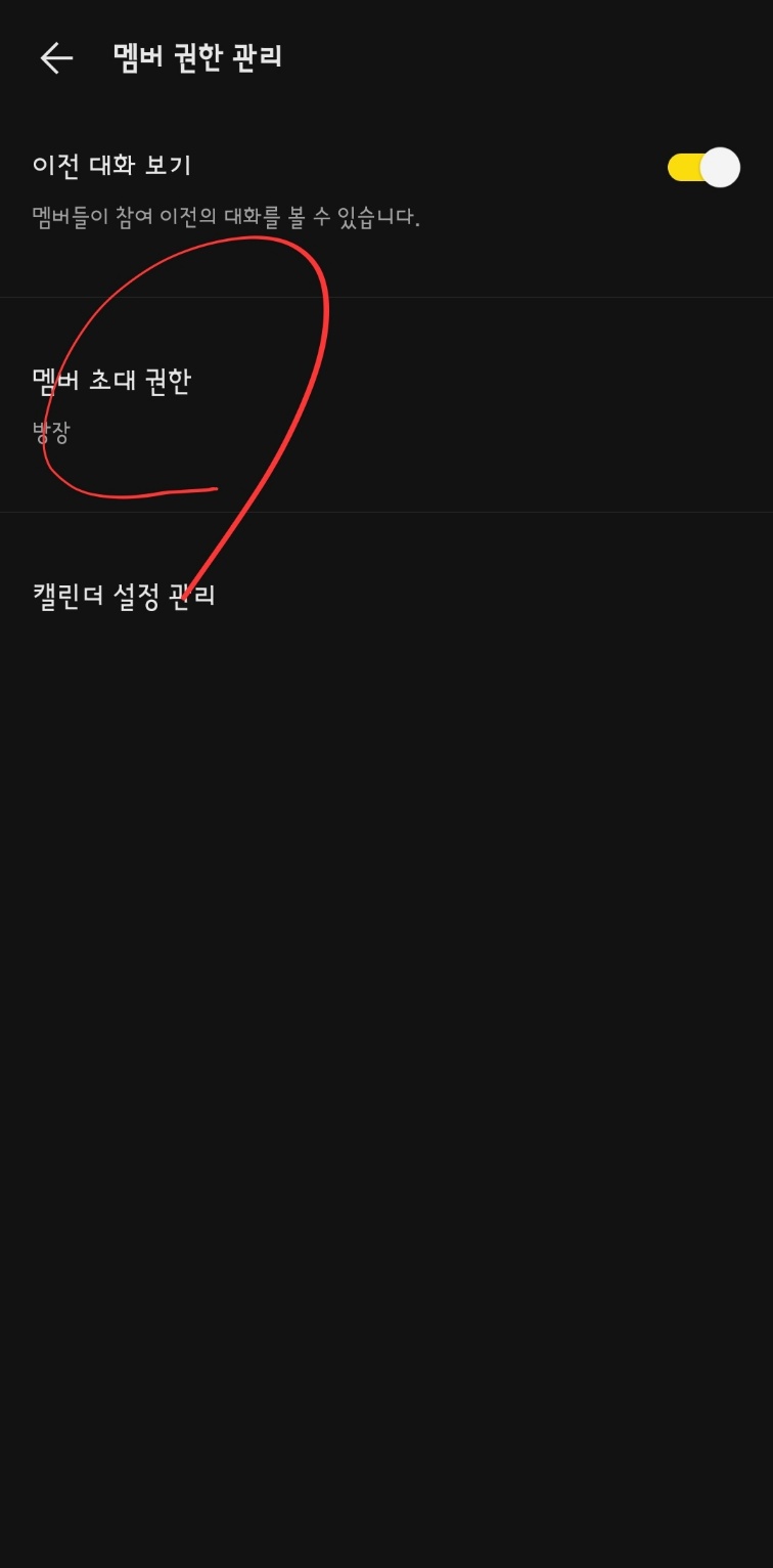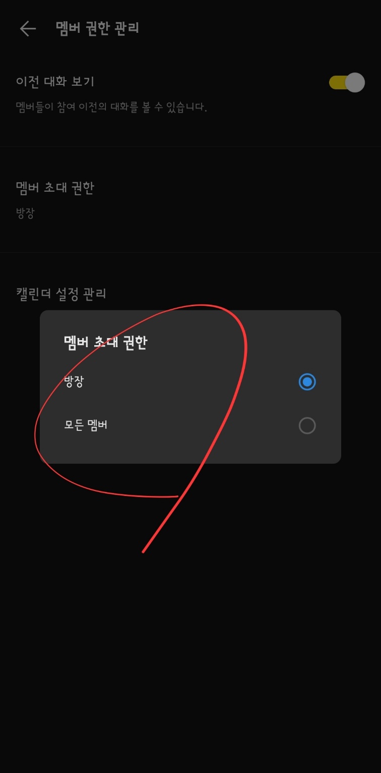기본으로 설정된 '방장'만 초대할 수 있는 것을 '모든 멤버'로 수정하면 '일반채팅'처럼 멤버 모두가 초대 권한을 갖습니다.