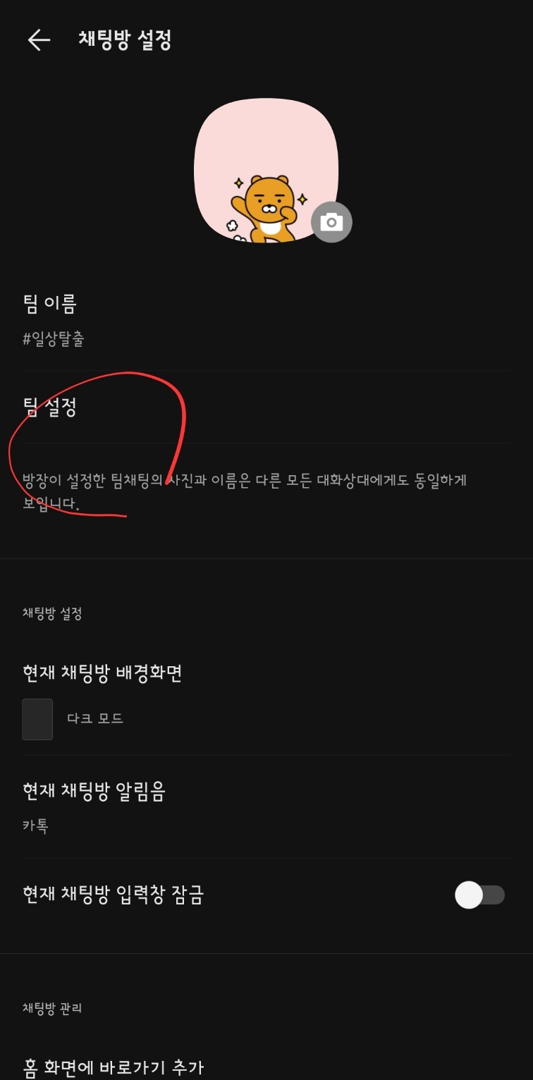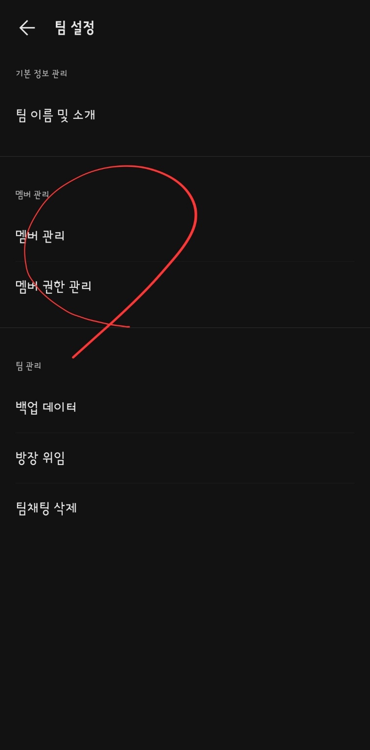 관리 항목 중 하나가 '팀 설정'입니다. 이곳에서 팀 운영의 근간을 변경할 수 있습니다. 기본 환경은 방장만 팀원을 초대할 수 있습니다.