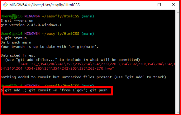 Git 명령어는 여러 명령을 묶어서 사용할 수도 있습니다. 명령어 사이에는 세미콜론(;)으로 구분합니다. 예를 들어 변경된 내용을 커밋하고 서버에 올리는 것까지 한꺼번에 수행할 수 있습니다.