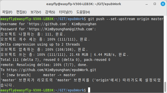 git push -u origin master명령어를 사용합니다.master는 브랜치 이름이며, 다른 브랜치 이름일 수도 있습니다.