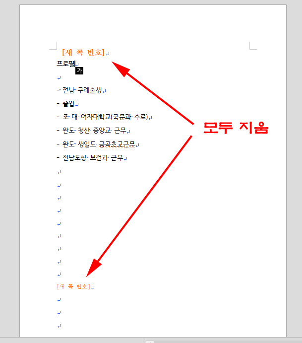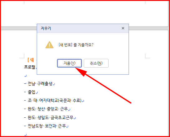 '지움'을 선택하면 [새 쪽 번호]가 지워지면서 중간에 시작된 쪽 번호는 사라집니다. 이 문서에서는 위에도 있고 아래에도 있습니다. 이것은 동일한 [새 쪽 번호 매기기]를 두 번 했기 때문입니다. 모두 지워주세요. 하나만 지우면 남은 [새 쪽 번호] 때문에 여전히 남습니다.