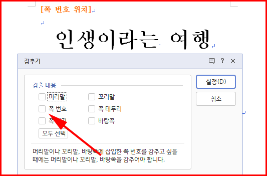감추는 의도는 표지 등 쪽 번호가 보이면 미감을 떨어뜨릴 수 있는 경우입니다. 다른 페이지의 경우도 감출 필요가 있는 페이지는 같은 요령으로 페이지를 감추면 됩니다. '감추기'는 쪽 번호 외에도 다음과 같이 다양하기 때문에 대화창에서 감출 대상을 선택하세요.