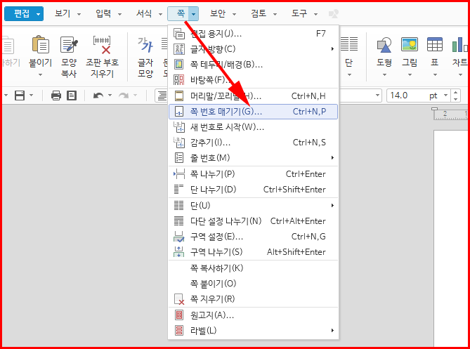 쪽 번호를 처음부터 설정하려면 첫 페이지로 이동합니다. 이곳에서 메뉴의 '쪽 > 쪽 번호 매기기'를 선택하면 첫 페이지부터 쪽 번호가 설정됩니다.