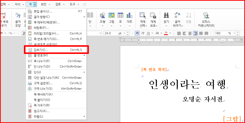 쪽 번호가 설정됐는데, 표지의 경우 쪽 번호가 안 보였으면 할 때는 [감추기]를 하세요. 감추고자 하는 페이지의 쪽 번호는 보이지 않게 됩니다.