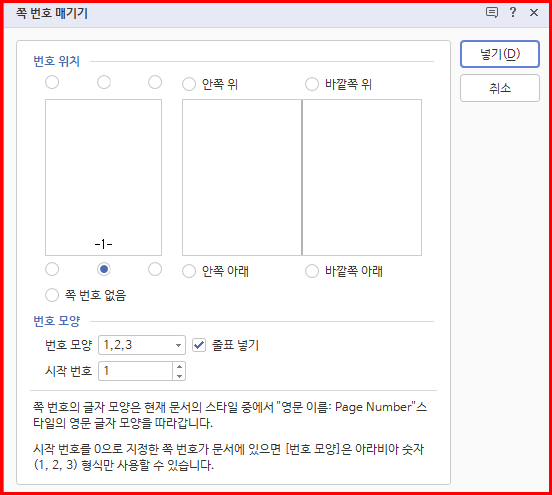 이때 '번호 위치' 등을 선택할 수 있습니다. 번호 모양이나 시작 번호도 다르게 설정할 수 있습니다. 기본 옵션대로 진행하려면 '넣기'를 선택하고 진행합니다.