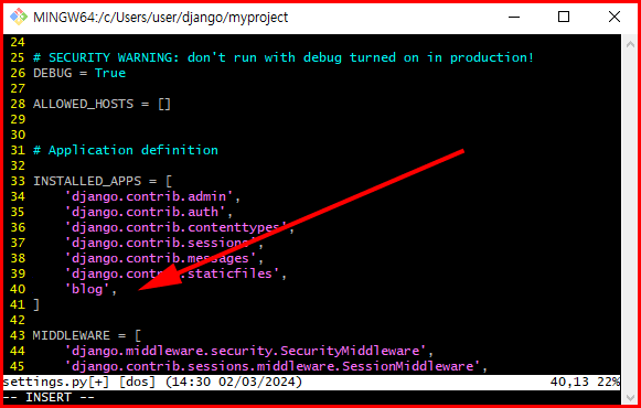 생성된 블로그 앱을 프로젝트의 설정에 추가해야 합니다. 프로젝트의 settings.py 파일을 열고, INSTALLED_APPS 설정에 blog 앱을 추가합니다:
