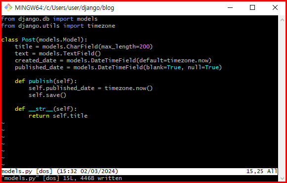 블로그 포스트를 위한 모델을 blog/models.py 파일에 정의합니다. 예를 들어, 포스트 제목, 내용, 작성일, 발행 여부 등의 필드를 포함할 수 있습니다:
