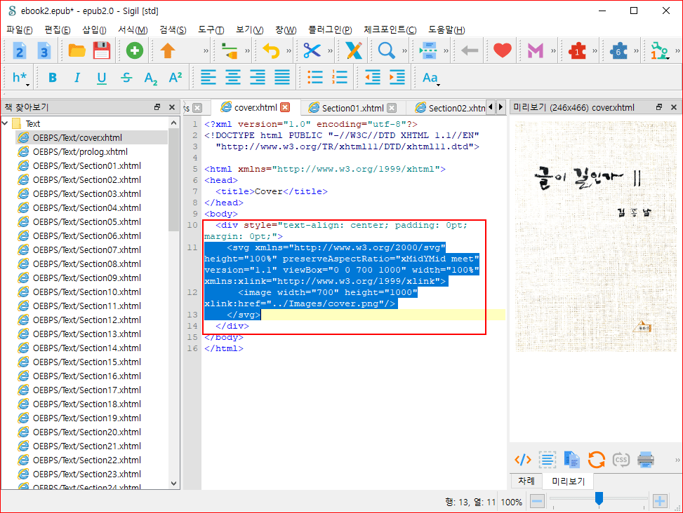 빨간 선으로 구분된 코드는 EPUB의 표지 이미지를 SVG 요소 안에 삽입하여, 전자책 리더기가 해당 이미지를 다양한 화면 크기에 맞게 유연하게 조정할 수 있게 해 줍니다. 이 방법을 사용함으로써, 이미지는 품질 손실 없이 다양한 해상도의 디스플레이에서 깨끗하게 보일 수 있으며, 이는 특히 고해상도 디스플레이를 사용하는 최신 디바이스에서 중요한 이점이 됩니다.