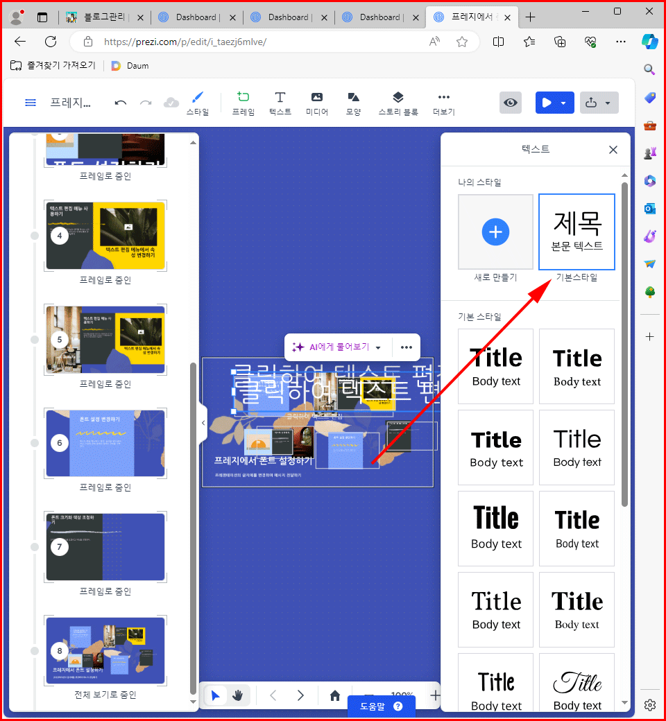 - 기본 스타일 설정 버튼을 클릭하면, 현재의 폰트와 스타일이 프레지의 기본 스타일로 저장되어, 새로운 슬라이드를 추가할 때마다 동일한 스타일이 적용됩니다.