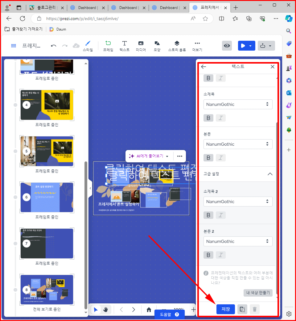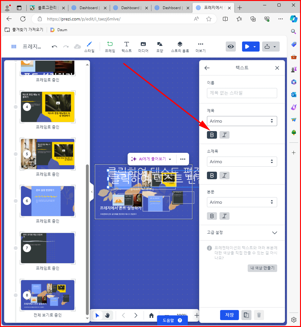 - 프레지 편집 화면에서 ‘테마’를 클릭합니다.