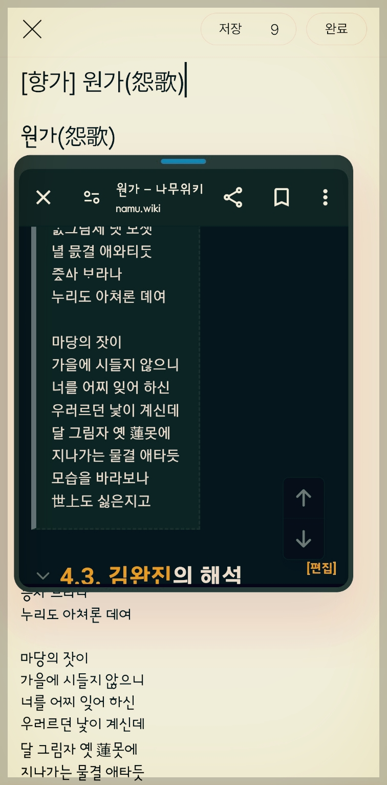 팝업 화면으로 띄운 '위키'는 구글 검색으로 얻은 결과이기 때문에 구글 앱이 작동된 것입니다. 팝업 창으로 띄운 화면 때문에 글 작성이 방해된다면 잠시 대기시킬 수 있습니다. 대기 중이 어플은 화면 어딘가에 아이콘으로 변경됩니다.
