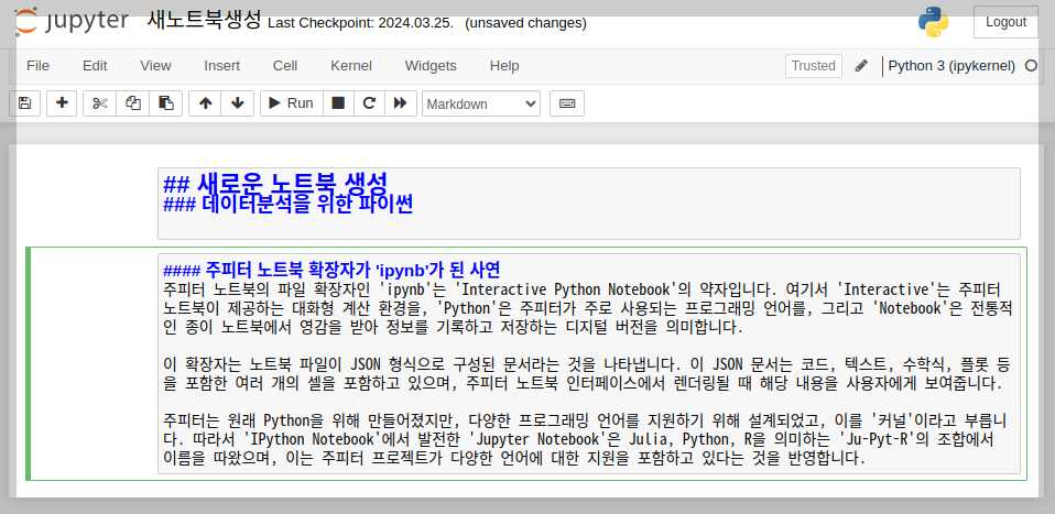 | [파이썬과 데이터분석] 주피터 노트북(Jupyter Notebook) (44) | 2024.04.07 |