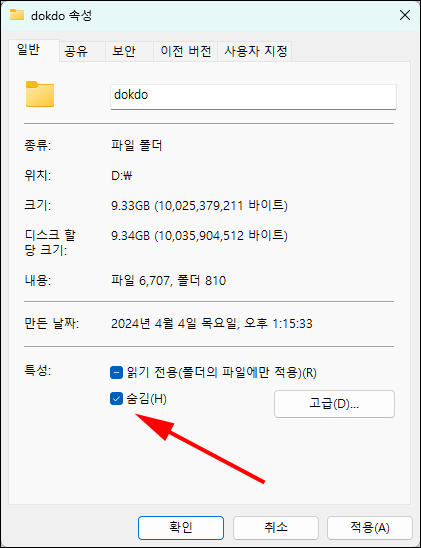 - '속성' 창이 열리면, 하단에 있는 '숨김' 옵션을 찾으실 수 있을 겁니다.