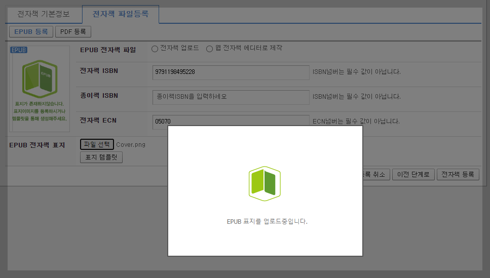 전자첵 표지를 따로 등록해야 뷰어에서 전자책 표지가 지원됩니다. 전자책 제작 과정에서 준비했던 표지 파일을 올립니다. 파일 이름은 'cover.png' 또는 'cover.jpg'입니다.
