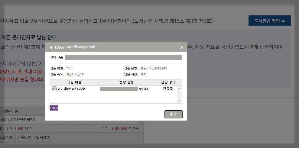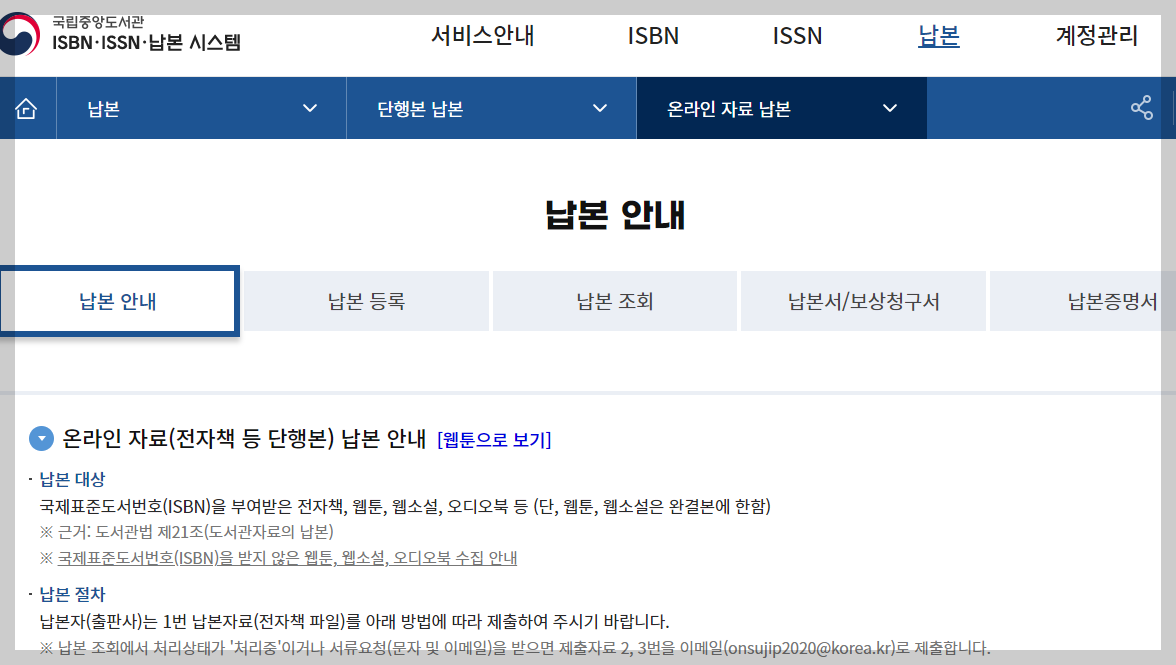 납본하는 과정은 양식에 따라 진행하면 됩니다. 파일을 먼저 전송하고 기타 부수되는 사항을 입력하고 마무리하면 됩니다. 납본 후 완결되기까지는 시일이 걸립니다. 납본이 결정되면 출판사 메일로 연락이 오면서 필요한 서류 등을 요구합니다. 정산서 등의 서류를 작성하여 메일로 송부하면 됩니다.