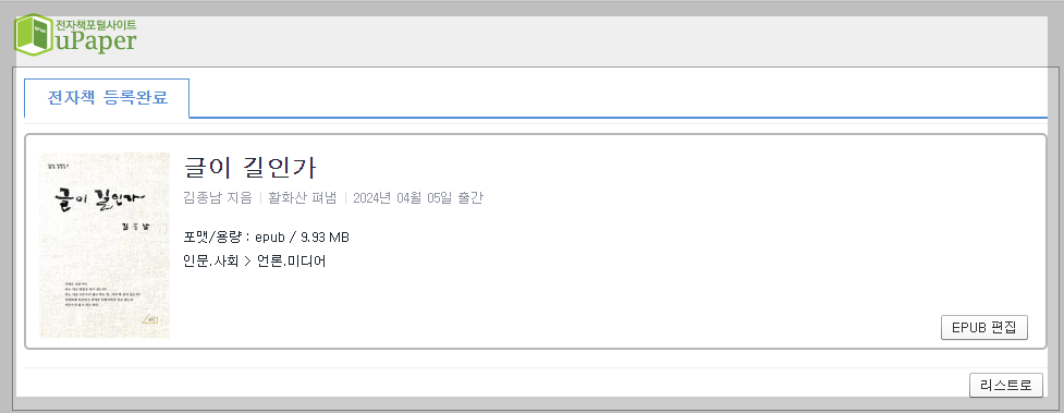 등록이 완료된 전자책은 아래와 같이 리스트에 나타납니다. 실제 배본되기까지는 uPaper 내부에서 검토하는 시일이 있습니다.