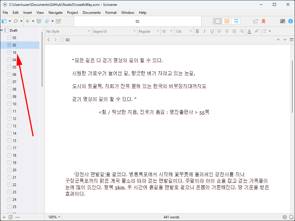 이렇게 하면 기존에 작성했던 텍스트 파일들이 스크리브너 프로젝트로 불러와져서, 스크리브너의 편집 및 관리 기능을 사용하여 문서를 작업할 수 있게 됩니다.