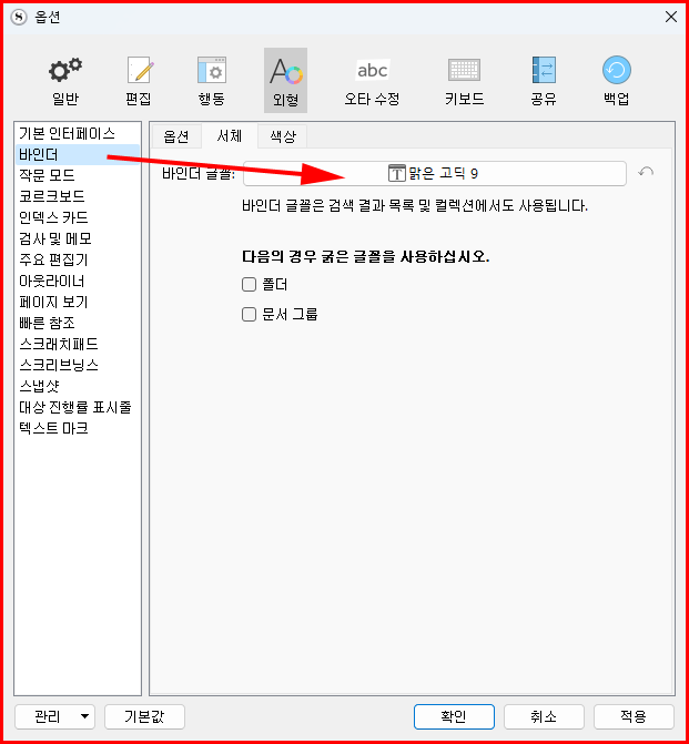 외형 설정에서 '바인더'란 스크리브너 좌측으로 아이콘과 글자가 함께 표시되는 영역입니다. 바인더는 고딕이나 돋움체의 'Sans-Serif' 글꼴을 사용하는 것이 보기가 편합니다.