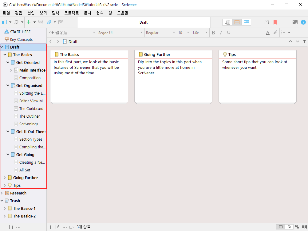 'Draft' 폴더는 작성 중인 원고의 모든 문서를 포함합니다. 이곳에는 새로운 텍스트 파일을 만들거나, 장과 장면 등의 글을 구조화하여 저장합니다. 구조는 계층적으로 이루어지며 하위 구조는 상위 구조에 포함됩니다. 바인더에는 그 계층의 구조가 직관적으로 알 수 있도록 배치됩니다.