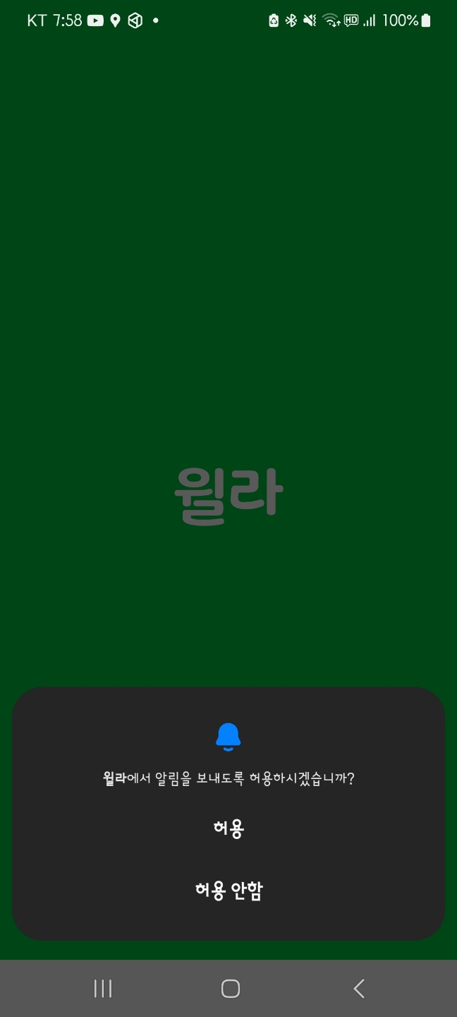 윌라를 처음 시작할 때 알림을 허용할 것인가를 묻습니다. 본인 취항에 따라 허용 여부는 결정합니다.