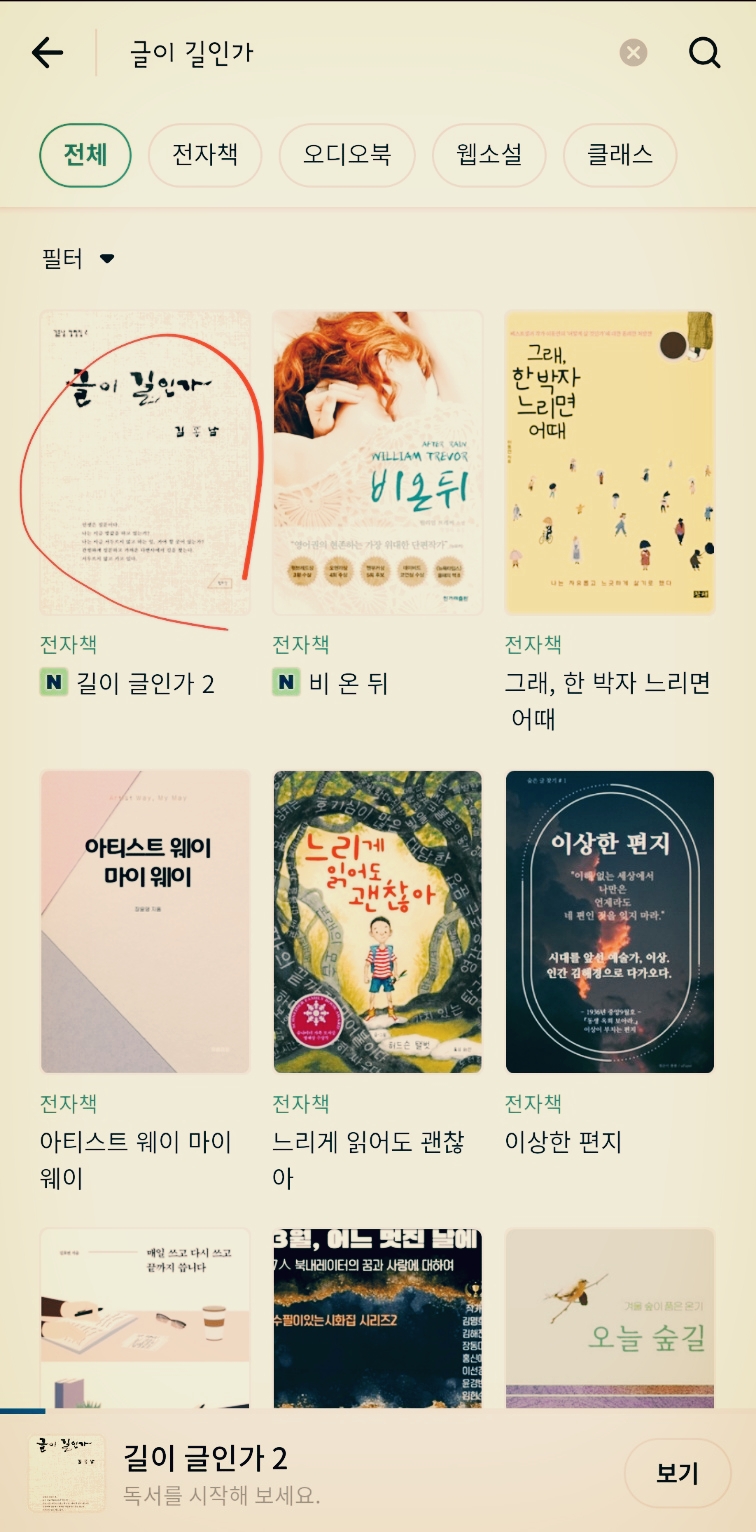 로그인이 성공하면 유료 여부는 무시하고 '글이 길인가'를 검색합니다. 김종남 선배님 전자책은 작가 선생님이 무료로 제공하기 때문에 누구든지 읽을 수 있습니다.