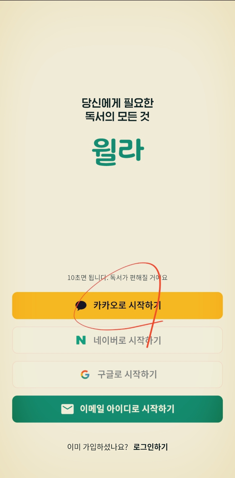 윌라 가입은 '카카오로 시작'을 선택합니다. 카카오톡 사용자는 쉽게 가입이 허용됩니다.