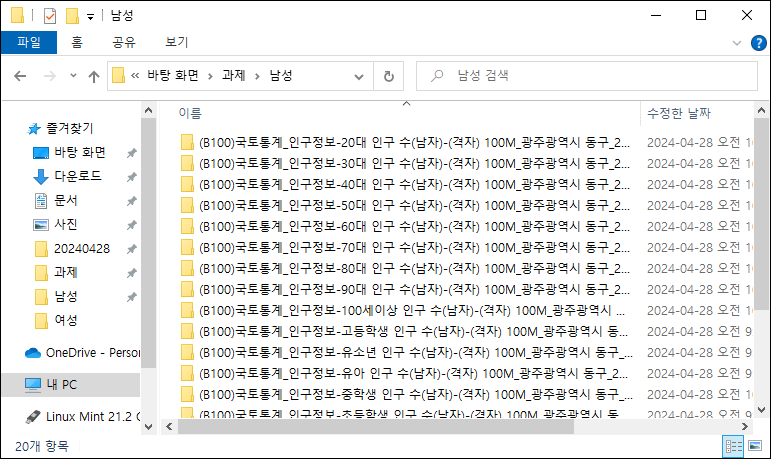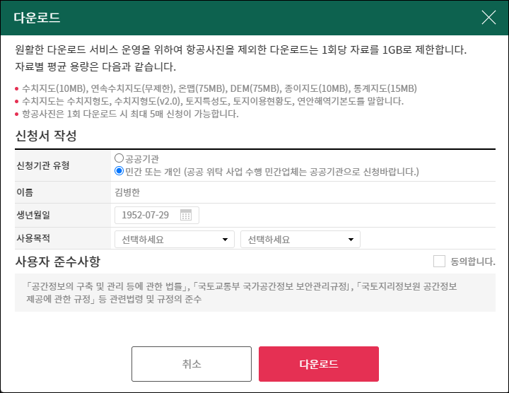 신청서는 다운로드받는 매회마다 작성하는 번거로움이 있습니다. 광주광역시 인구 데이터를 받는데 28회의 신청서를 작성했습니다. 상당한 끈기가 필요했습니다.