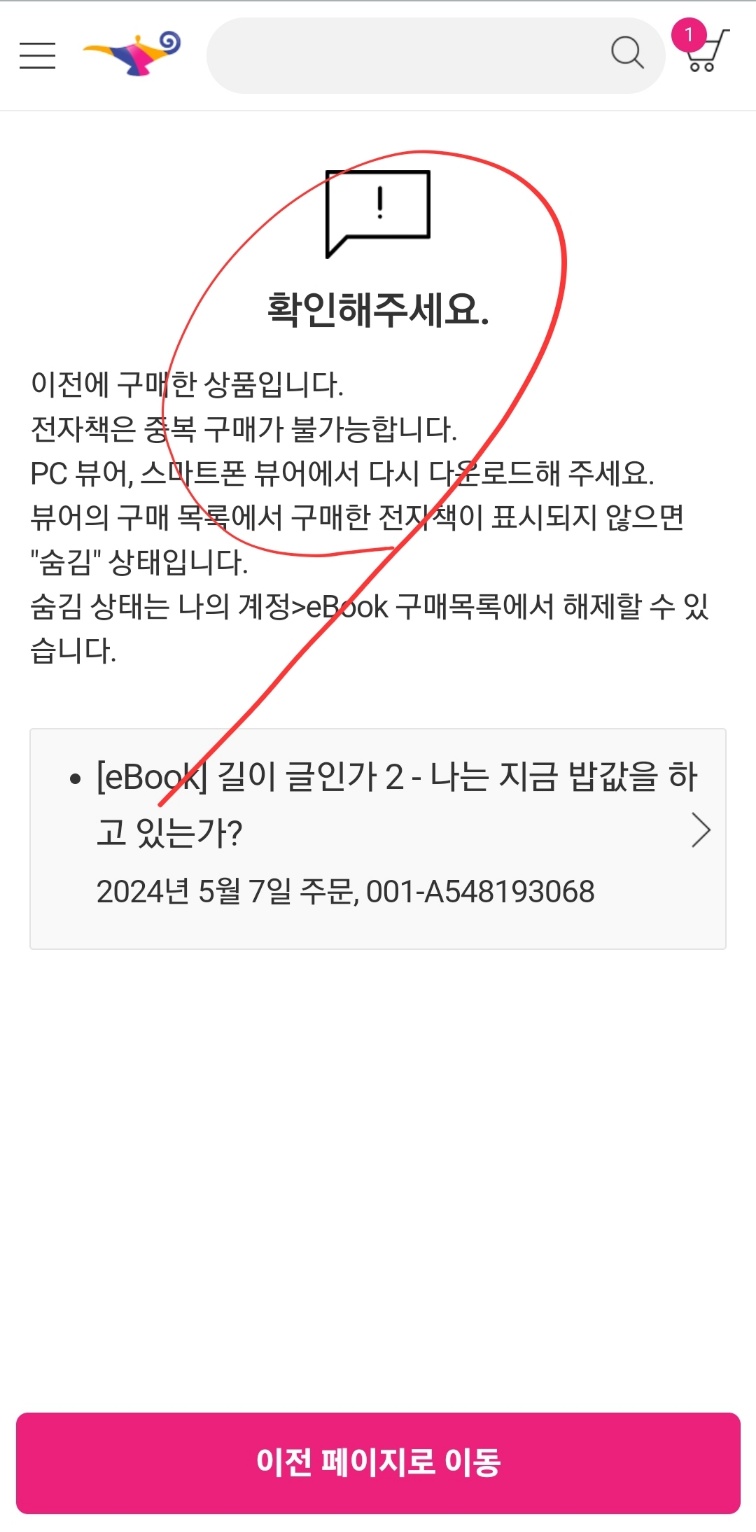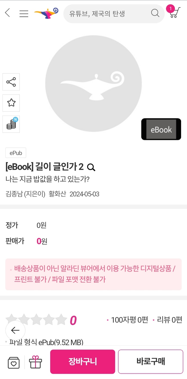 카카오톡으로 보낸 링크를 누르면 알라딘 서점의 전자책 '글이 길인가 2'로 연결됩니다. 갑자기 '밥값'은 해야겠다는 생각이 들게 '0'이 눈에 들어옵니다. 숫자 세계나 삶에서 모두 영특한 해결책으로 통하는 '0'. 여기서도 '바로 구매' 버튼으로 손이 갈 수밖에 없습니다. 그러나 바로 손가락이 방정맞았다고 후회하게 됩니다. 무료라면서 무슨 절차가 이리 까다로운지.