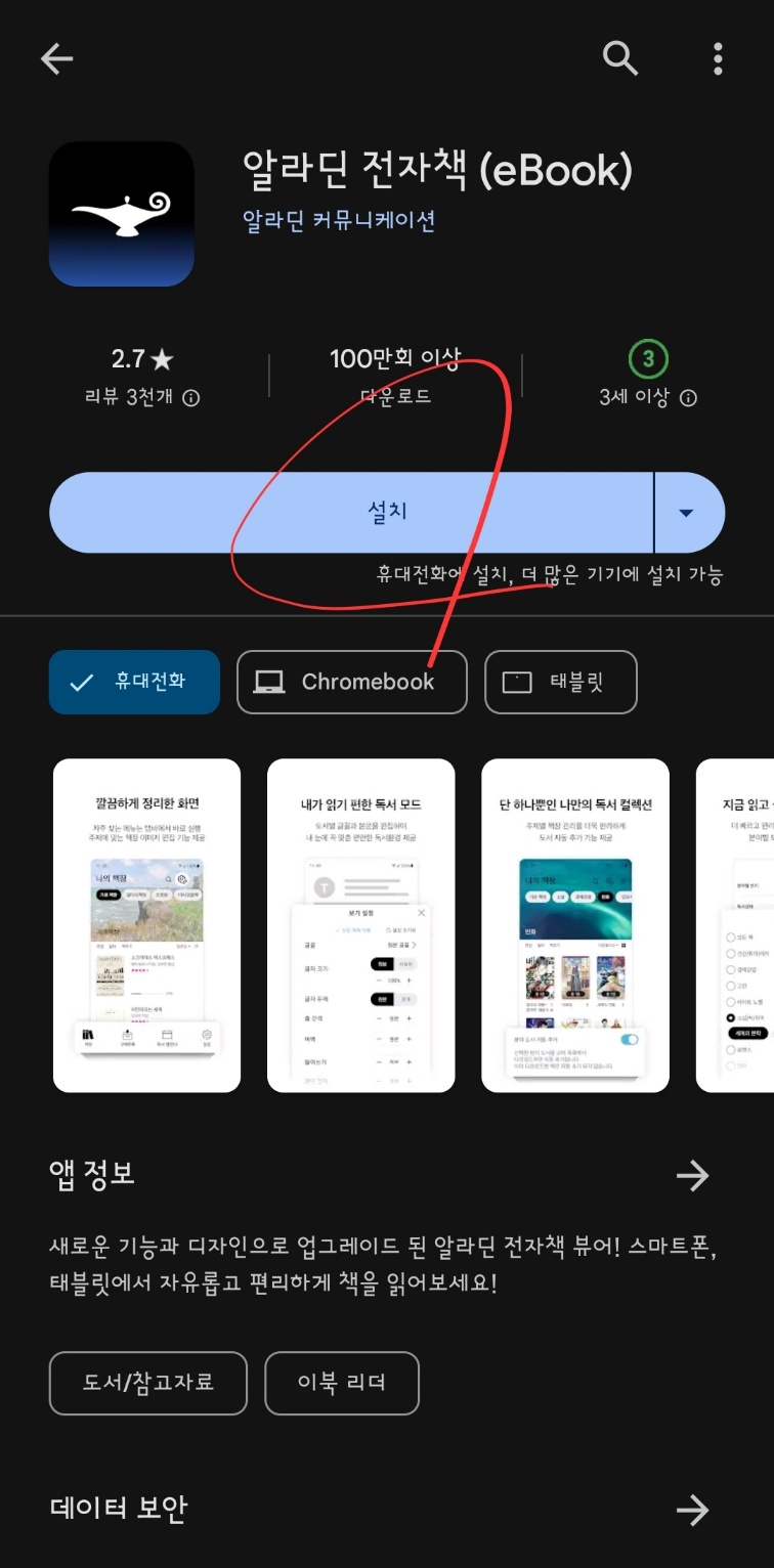 전자책을 읽는 데는 뷰어 설치가 필수입니다. '알라딘'은 파란 램프로 뷰어(쇼핑몰은 빨간 램프)를 제공합니다.