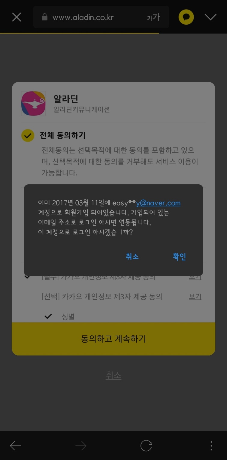 국민소통앱이 된 카카오톡 인증을 통하면 쉽게 가입 문제가 풀립니다. 이미 가입된 회원은 귀신같이 알고 다음처럼 알려줍니다. 회원이 아니라면 가입 절차를 밟습니다.