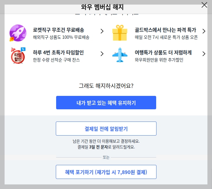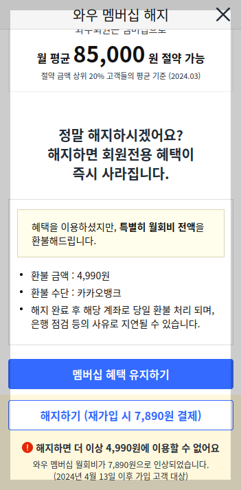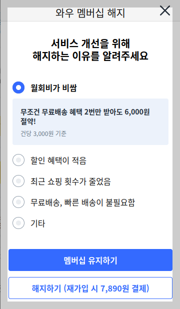 해지하는 이유를 묻네요. 당연 '윌회비가 비쌈' 이지요. '재가입 시 7,890원 결제'라고 나오는데, 더욱 화가 치밀군요. 월 회비 인상을 다시 한번 되새기게 하는군요.