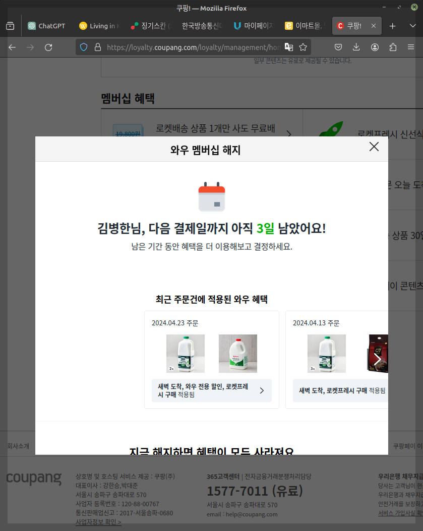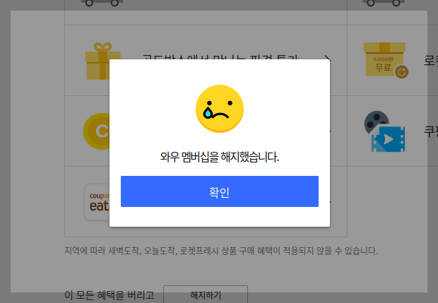 '해지'를 선택했더니 눈물을 보이군요. 회비 인상을 하지 말지. 이제 눈물을 보이면 뭐냐구요. 나는 영영 쿠팡과는 결별입니다. 다른 배송 서비스를 이용할 수도 있지만. 제 경우는 인근 마트를 이용할 생각입니다. 미력하나마 지역 경제에 보탬이 돼 보려구요.