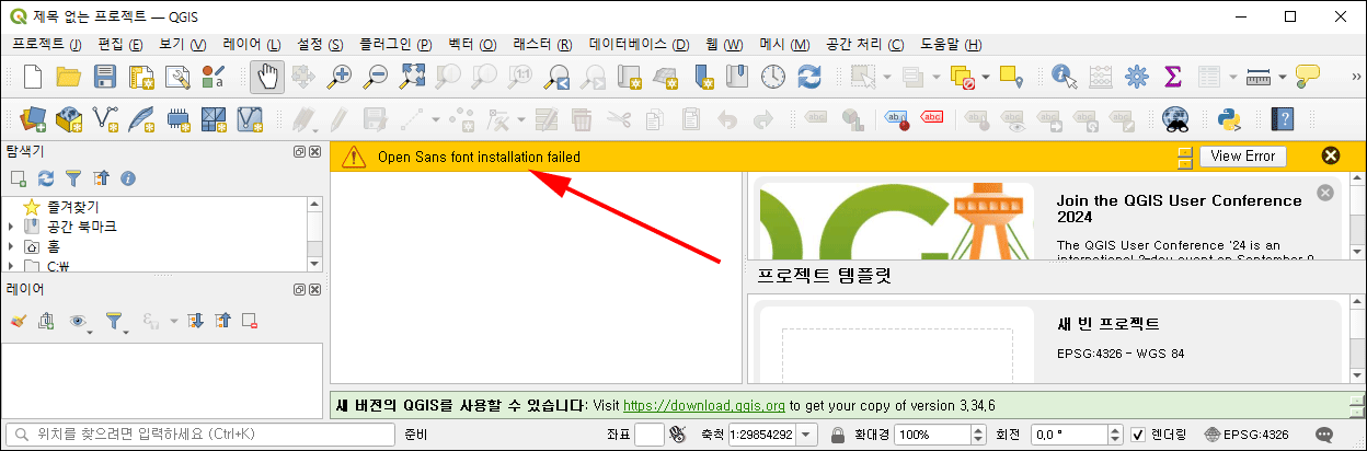다음과 같은 에러 메시지 "Open Sans font installation failed"로, QGIS가 Open Sans 폰트를 설치하는 데 실패했음을 나타냅니다. Open Sans는 QGIS 사용자 인터페이스에서 기본적으로 사용되는 폰트 중 하나입니다. 이 폰트는 구글에서 제공하는 폰트로 수동으로 설치하면 해결됩니다.