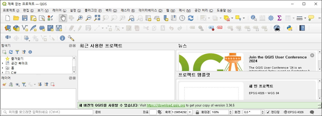 폰트가 설치된 상태에서 실행합니다. 건강한 QGIS 프로그램 화면을 만나게 됩니다.