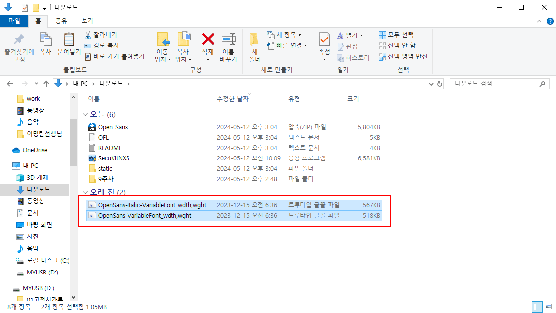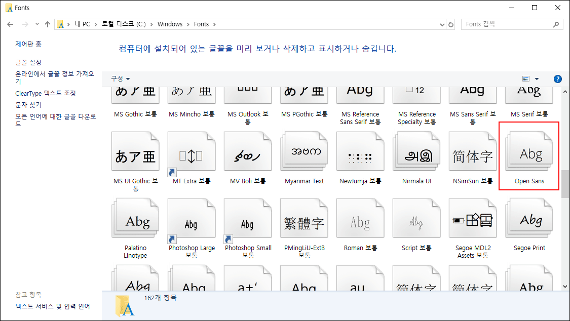 다운로드한 폰트를 더블 클릭하여 설치하거나 마우스 우클릭하여 나타나는 팝업 메뉴에서 '설치'를 선택하면 됩니다. 또는 'C:\Windows\Fonts' 폴더에 드래그 앤 드롭해도 해결됩니다.