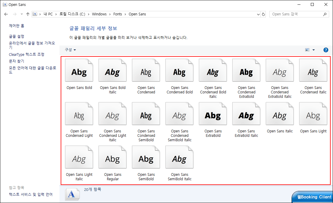 상세 내역을 확인하면 아래와 같이 20개 폰트가 설치되어 있습니다. 이 폰트들이 없어 생긴 에러이기 때문에 폰트가 설치된 뒤에 QGIS를 실행하면 이상 없이 실행됩니다.